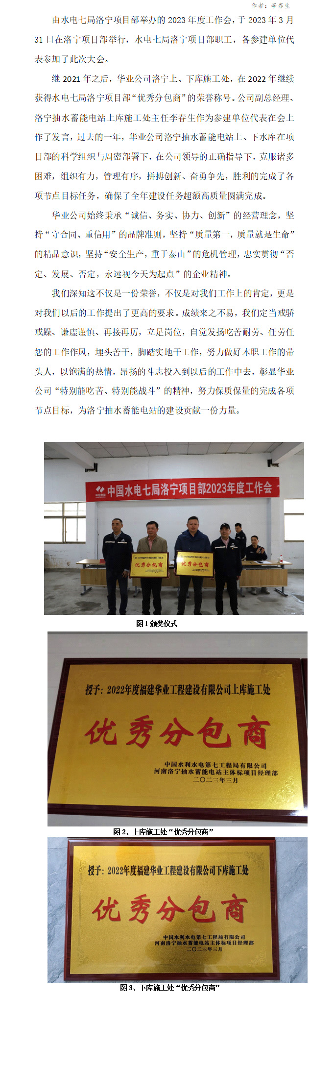 公司洛宁抽水蓄能电站上、下库施工处双双获得“优秀分包商”称号